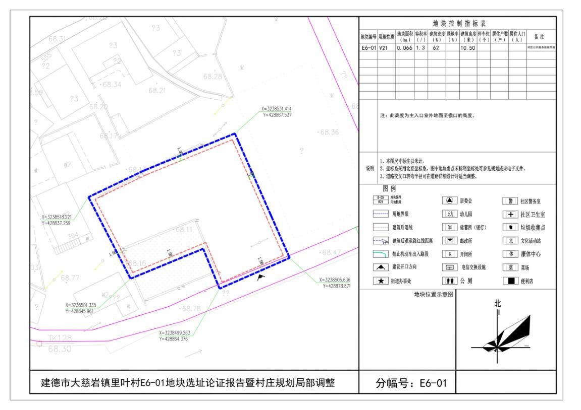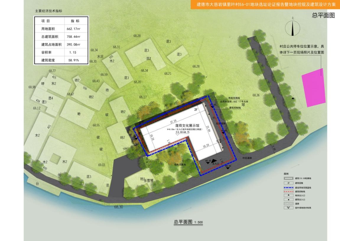 本項(xiàng)目地塊位于建德市大慈巖鎮(zhèn)里葉村,其北面、西面、東面均為里葉村住宅區(qū),南面隔村莊道路為游埠溪,隔游埠溪為龍葛線(S21)。用地性質(zhì)為村莊公共服務(wù)設(shè)施用地(V21)。地塊總用地面積662.17平方米,建筑密度≤62%,容積率≤1.3,建筑檐口高度≤10.5米。