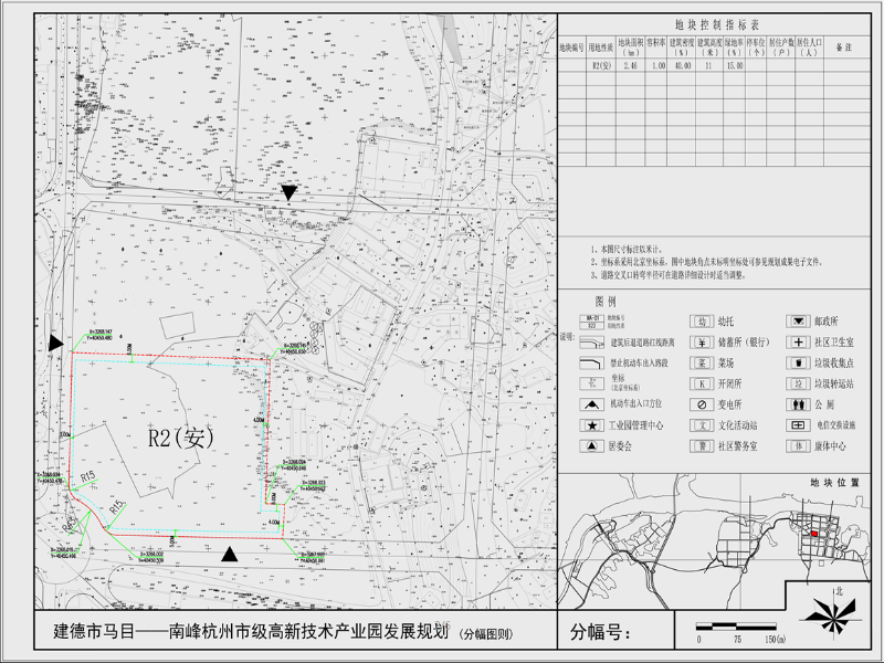 用地性質(zhì)為二類居住用地(R2安),地塊控制指標為:建筑密度≤40%,建筑高度≤11米,容積率:1.0≤容積率≤1.3,綠地率:≥15%,建筑風格與造型:現(xiàn)代風格。