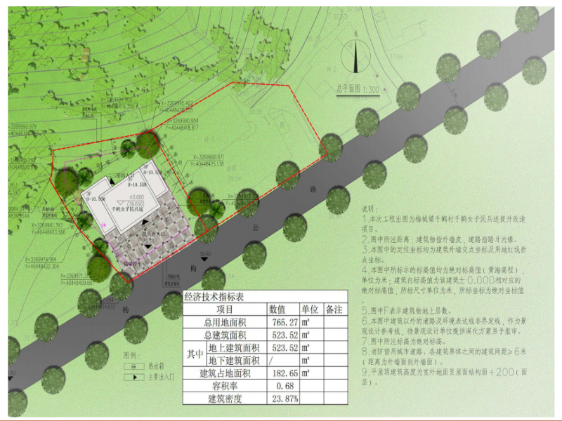 地塊用地面積765.27㎡,0.6≤容積率≤1.0,建筑密度≤30%,30%≤綠地率,建筑高度≤12米,出入口方位為南側(cè)。