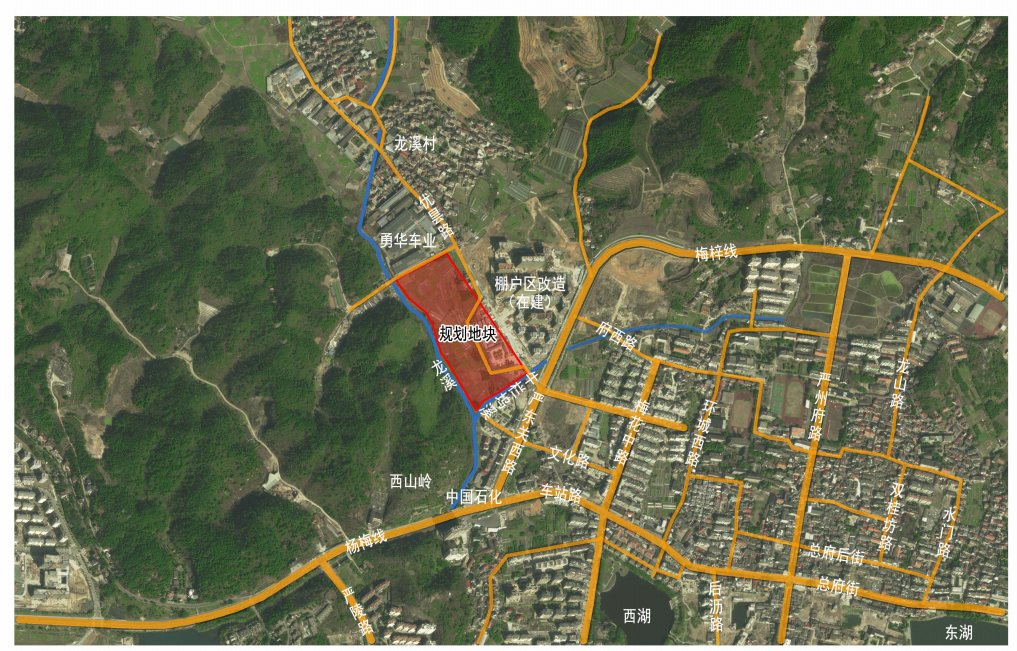 本項目基地位于梅城鎮(zhèn)西湖村與龍溪村交界,梅城鎮(zhèn)棚戶區(qū)改造安置房建設工程一期項目西側(cè),地塊東側(cè)為棚戶區(qū)改造安置房建設工程一期,南側(cè)為過境公路,西側(cè)為山,北側(cè)為勇華車業(yè)廠房;規(guī)劃為二類居住用地(R2)和道路用地,為解決梅城鎮(zhèn)棚戶區(qū)改造和美麗城鎮(zhèn)建設以來征遷安置問題,有效地發(fā)揮土地利用的最大價值,解決梅城鎮(zhèn)棚戶區(qū)改造征收安置問題,現(xiàn)將規(guī)劃進行調(diào)整,該地塊地塊調(diào)整為二類居住用地,并明確指標如下: