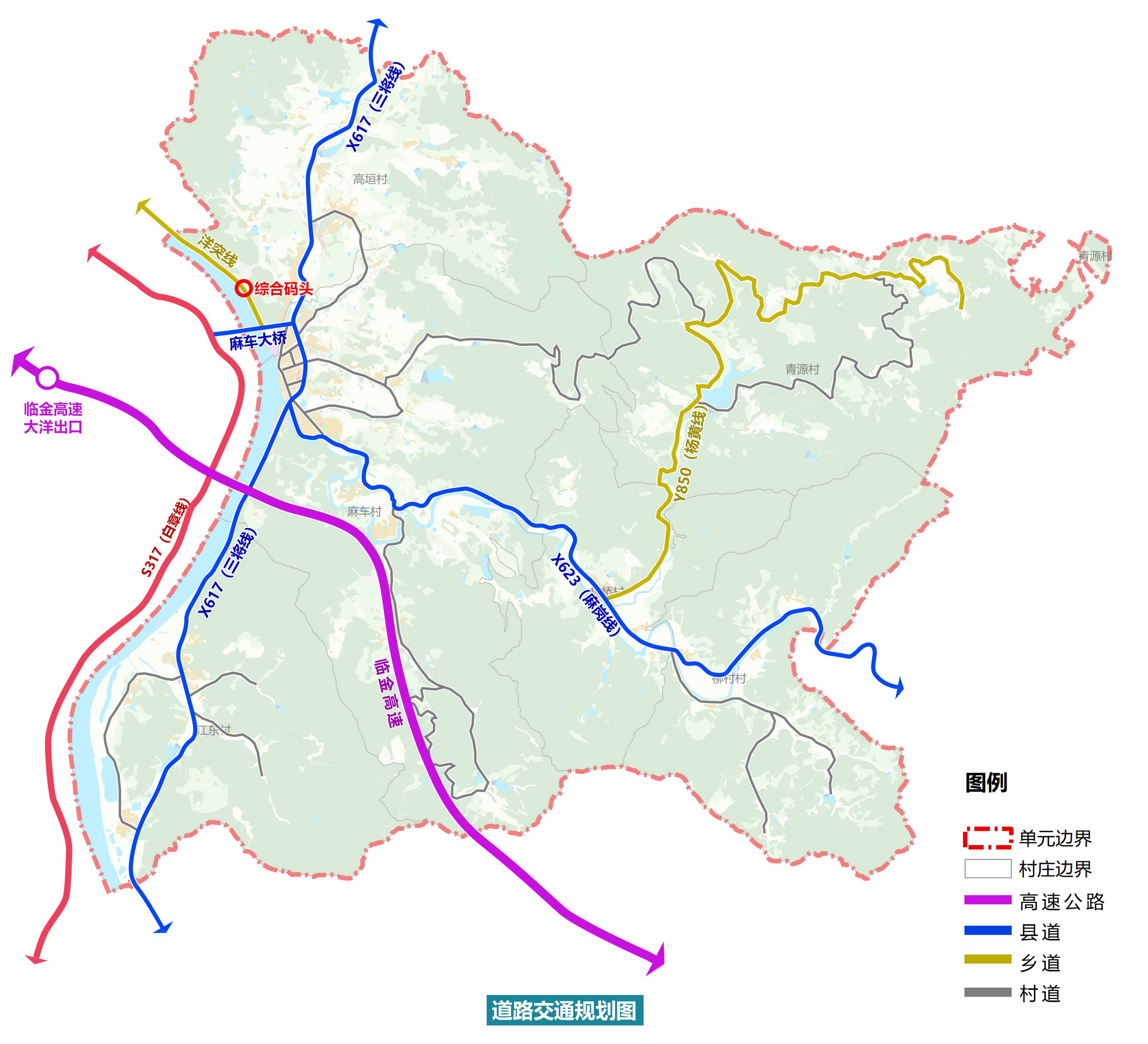 規(guī)劃充分研究現(xiàn)狀,結(jié)合用地布局和功能區(qū)的劃分,對(duì)上位規(guī)劃路網(wǎng)體系進(jìn)行必要的調(diào)整,形成適合于用地需求的路網(wǎng)系統(tǒng)。麻車單元內(nèi)道路分高速公路、縣道、鄉(xiāng)道和村道。