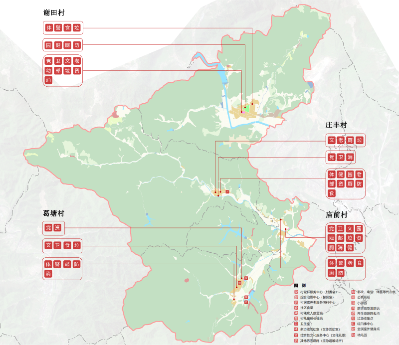 行政村級公共服務設施:規(guī)劃在各行政村交通便利的中心地段設置公共服務設施,鼓勵治理與服務、文化體育、醫(yī)療衛(wèi)生等功能復合設置,形成行政村級綜合型“鄰里中心”。
