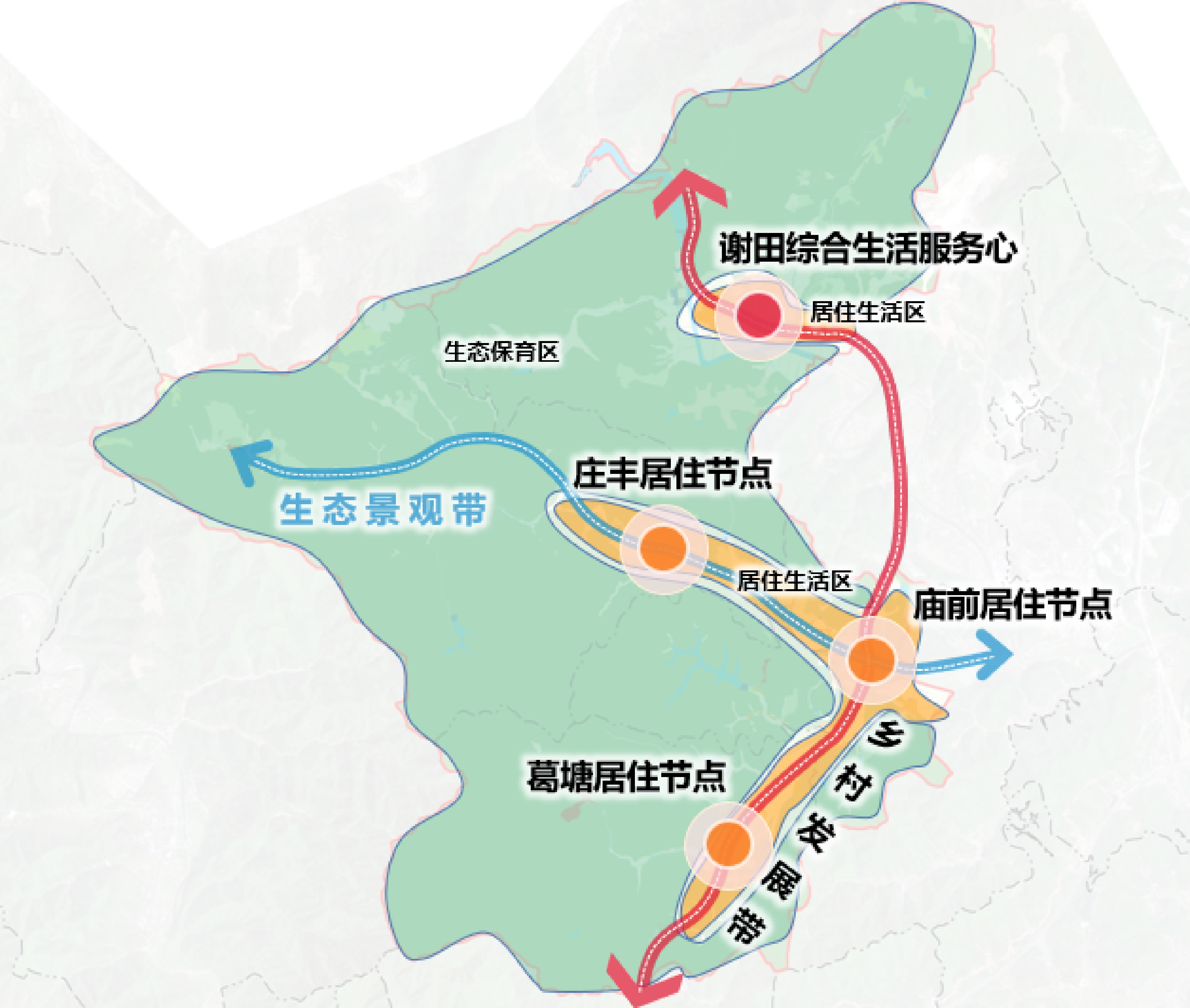 兩帶:一是以鄉(xiāng)村未來發(fā)展為主導的縱向鄉(xiāng)村發(fā)展帶,銜接欽堂村,依托現(xiàn)實可發(fā)展空間進行帶狀建設發(fā)展;二是以生態(tài)發(fā)展為主,局部結合居住、產(chǎn)業(yè)發(fā)展的生態(tài)景觀帶。