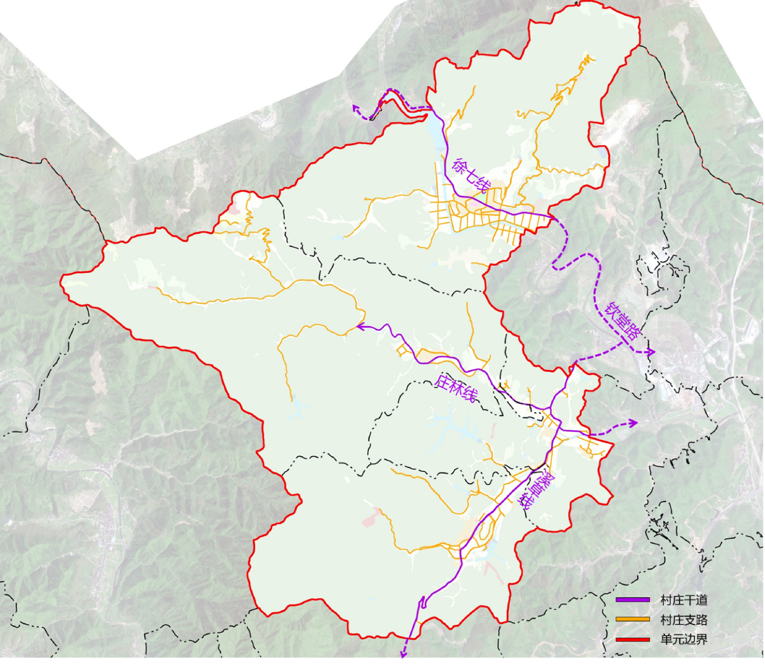 外部交通體系以徐七線、莊林線和溪草線三條村莊干道為主,形成“兩橫一縱”的主要交通結構,并通過謝田村內(nèi)的欽堂路進行聯(lián)系。內(nèi)部道路體系由村莊支路構成。規(guī)劃結合現(xiàn)狀道路與地形條件,加強村莊間的干道聯(lián)系,并依據(jù)居民點分布狀況完善村莊支路網(wǎng)建設,拓寬過窄道路,便捷村民日常生產(chǎn)生活。