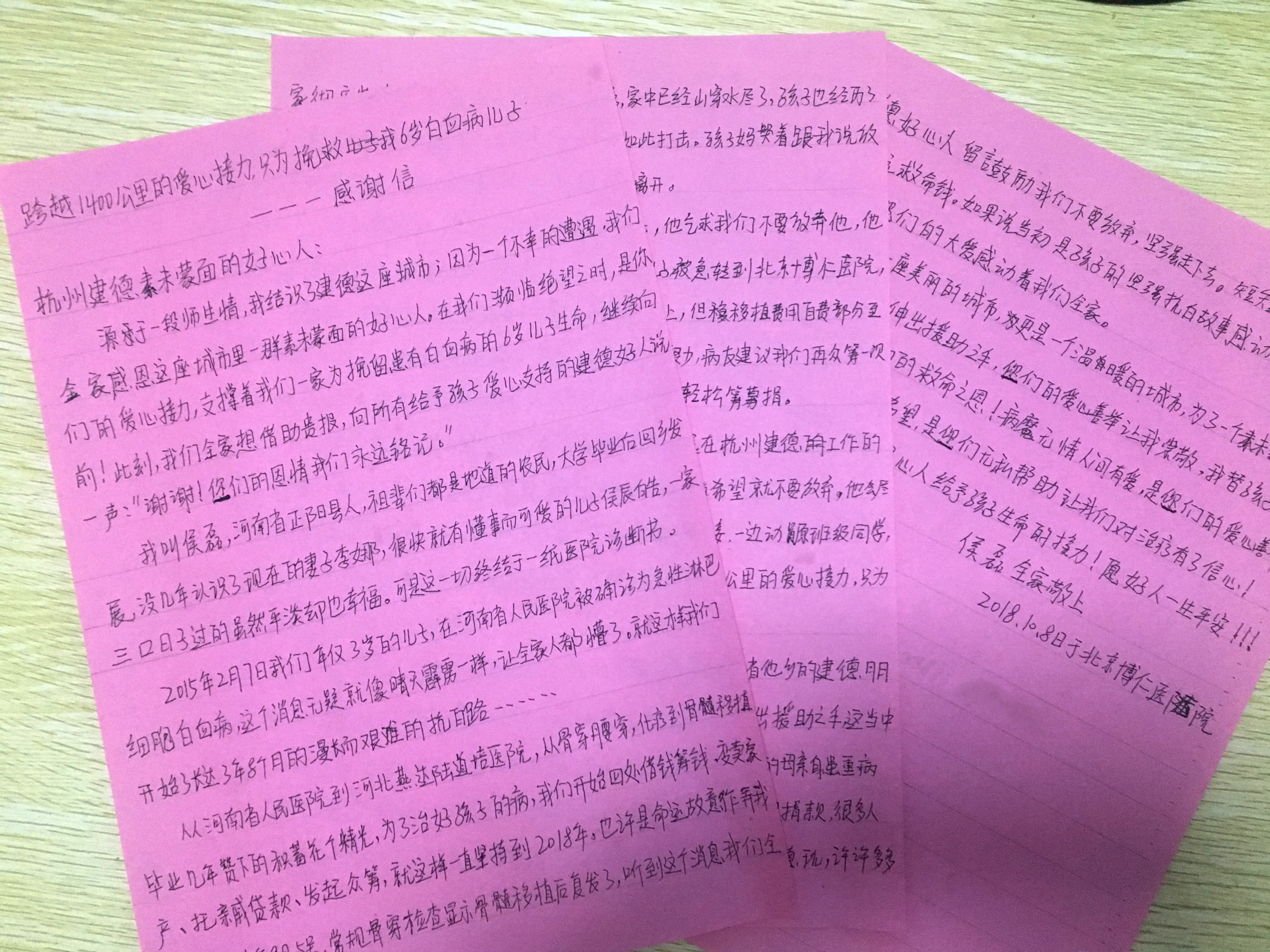 編者按:“建德是一座美麗的城市,更是一個溫暖的城市?!苯袢眨緢笫盏揭粋€順豐快遞,里面是一封感謝信。寫信人是千里之外的河南正陽人侯磊,他想通過本報感謝建德所有好心人,為他6歲患白血病的兒子慷慨伸出援手,為他們點燃了孩子生命的希望。現(xiàn)將《感謝信》全文刊發(fā)。