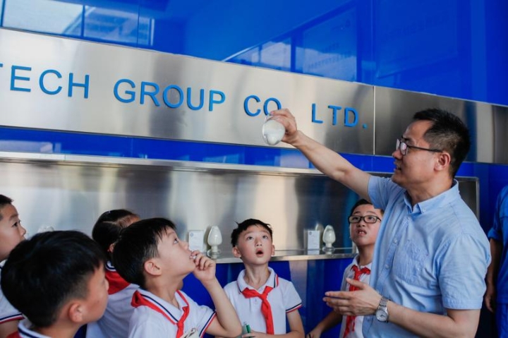 是日,王國平帶著少先隊員們了解觀察公司最新產品,為孩子和家長講解化工與生活的聯(lián)系,并為孩子們演示了簡單有趣的化學小實驗?!巴跏迨?,您喜歡看什么書?”“王叔叔,您為什么喜愛化學?”在耐心解答每個孩子的問題后,王國平述說了自身學習科研的經歷,鼓勵孩子們無論在學習和生活中都要勤于思考,善于發(fā)現(xiàn)問題,解決問題,在不久的將來以更多創(chuàng)新技術回報祖國和社會。