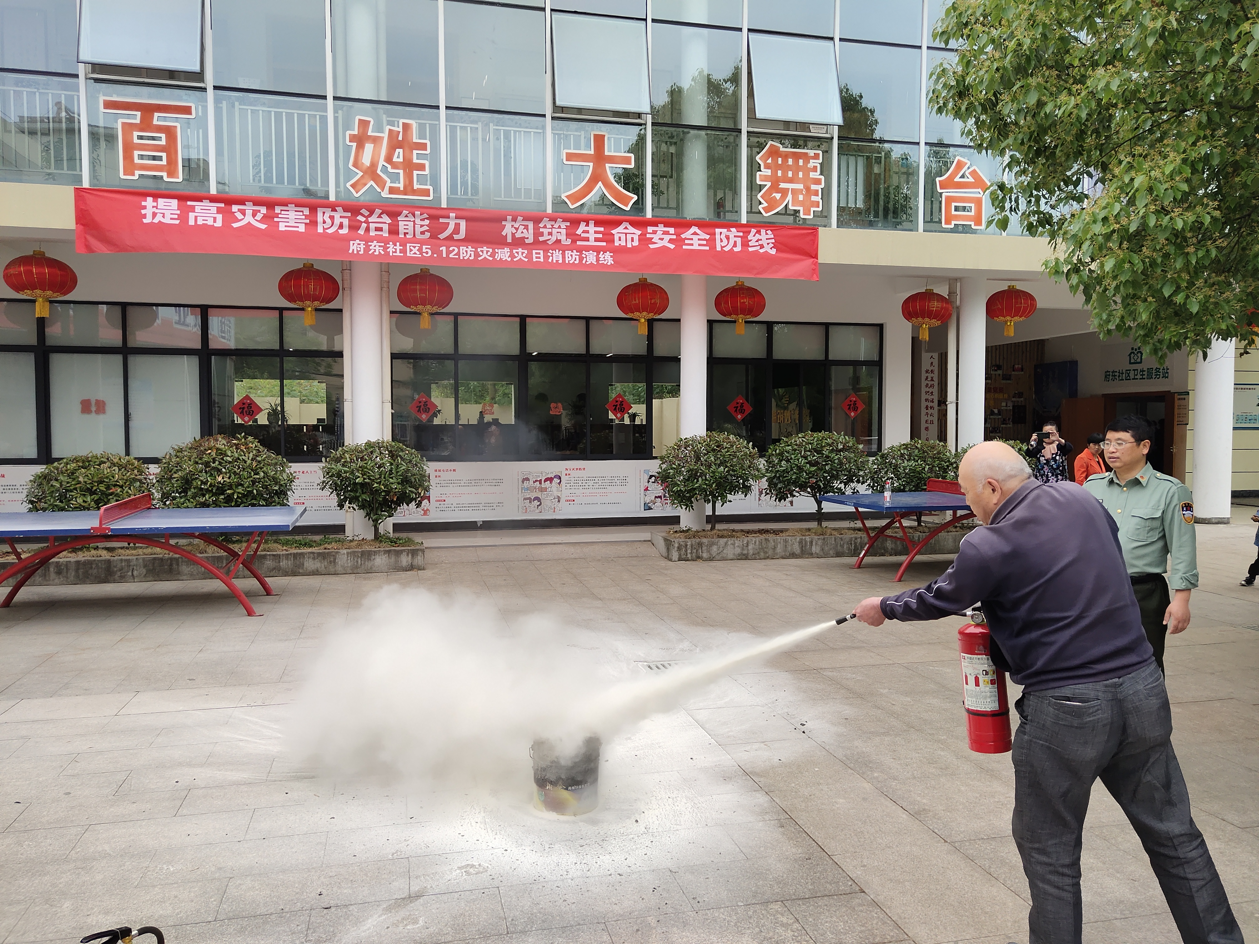 5月8日,在第十一個(gè)全國(guó)防災(zāi)減災(zāi)日來(lái)臨之際,府東社區(qū)組織社區(qū)居民開展消防安全演練。
