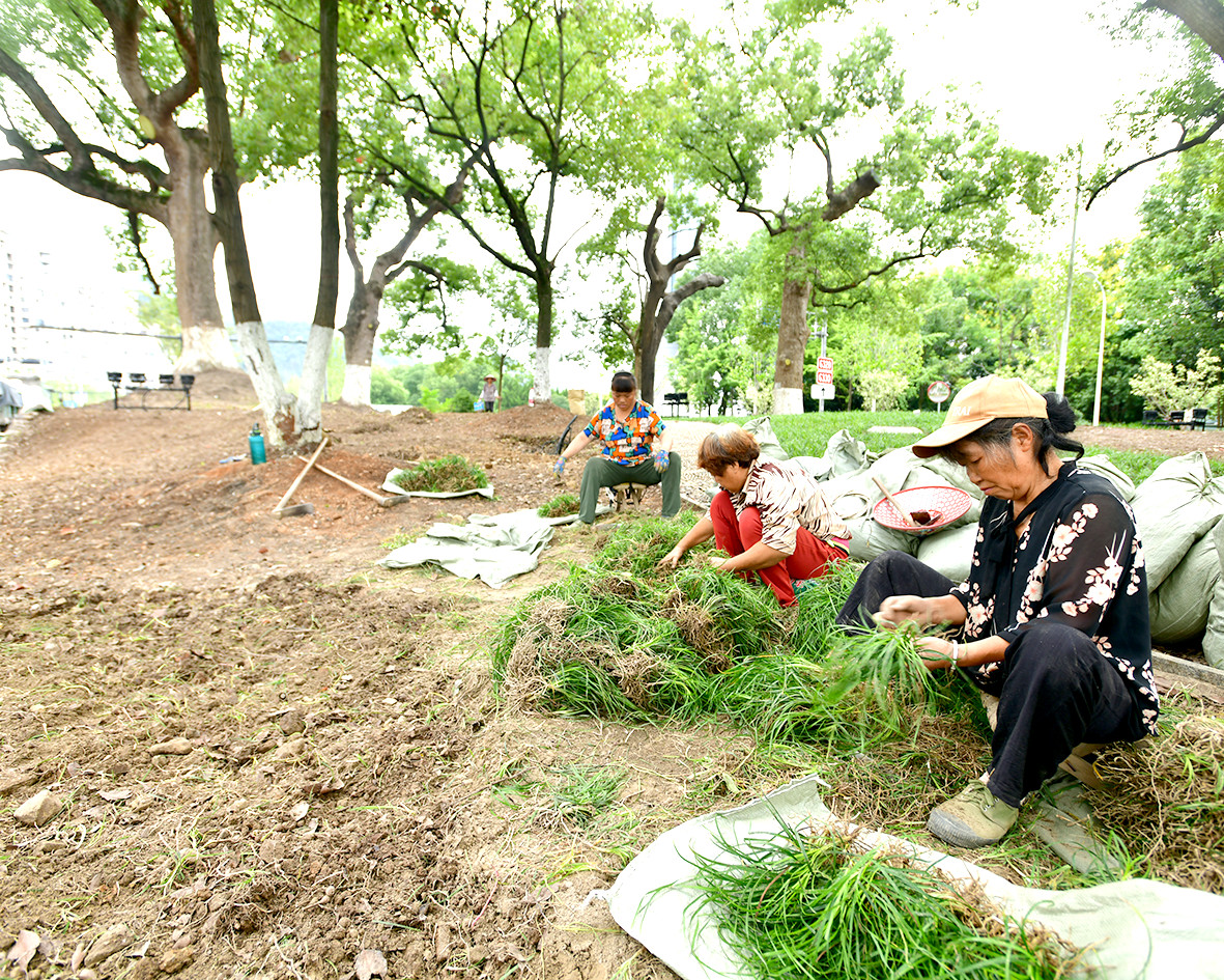 連日來(lái),我市抓緊在新安江城區(qū)的公園、廣場(chǎng)、道路等公共綠地種植或更換花草,美化家園,為即將舉行的杭州亞運(yùn)會(huì)增添亮麗的風(fēng)景。圖為工人們?cè)谛掳步w育館附近的大樟樹下準(zhǔn)備種植麥冬等綠化植物。