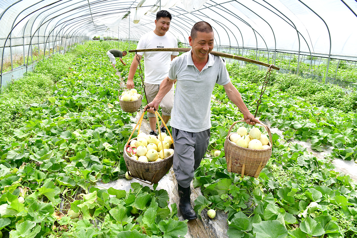 今年以來,楊村橋鎮(zhèn)長寧村對20多畝標(biāo)準(zhǔn)地采用“玉米+甜瓜+草莓”的輪作模式,通過統(tǒng)一種植、統(tǒng)一管理、統(tǒng)一銷售,帶動周邊農(nóng)戶就業(yè)增收,為鄉(xiāng)村經(jīng)濟(jì)發(fā)展注入了新的活力。圖為村干部正在長寧村標(biāo)準(zhǔn)地里采摘成熟的甜瓜。