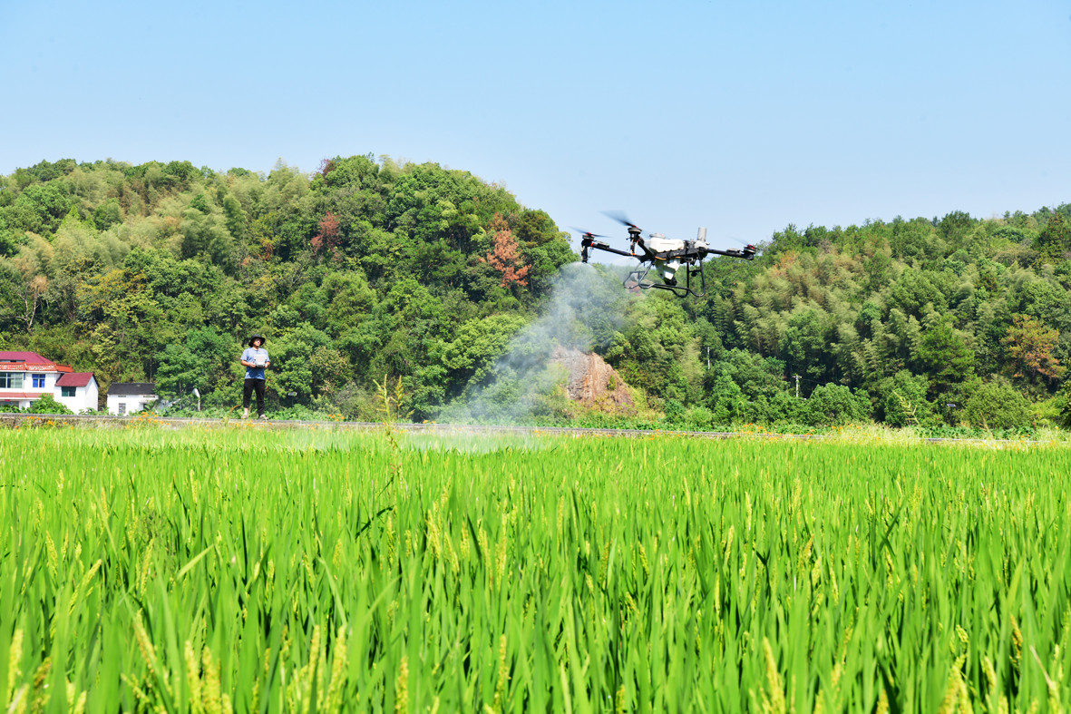 眼下正值單季晚稻病蟲害管理的關鍵期,我市各地涉農(nóng)企業(yè)、合作社、家庭農(nóng)場積極利用現(xiàn)代農(nóng)業(yè)設備,抓好晚稻田間管護,進行防病滅蟲、加強水肥管理,助力豐產(chǎn)增收。圖為下涯鎮(zhèn)之江村的田間,農(nóng)機手正操作無人植保機進行飛防作業(yè)。
