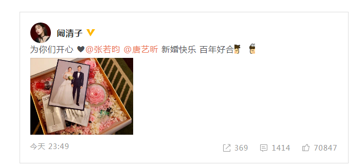 新浪娛樂訊 6月26日晚,闞清子[微博]在微博曬出張若昀[微博]唐藝昕[微博]婚禮伴手禮,并發(fā)文祝二人“新婚快樂,百年好合”。