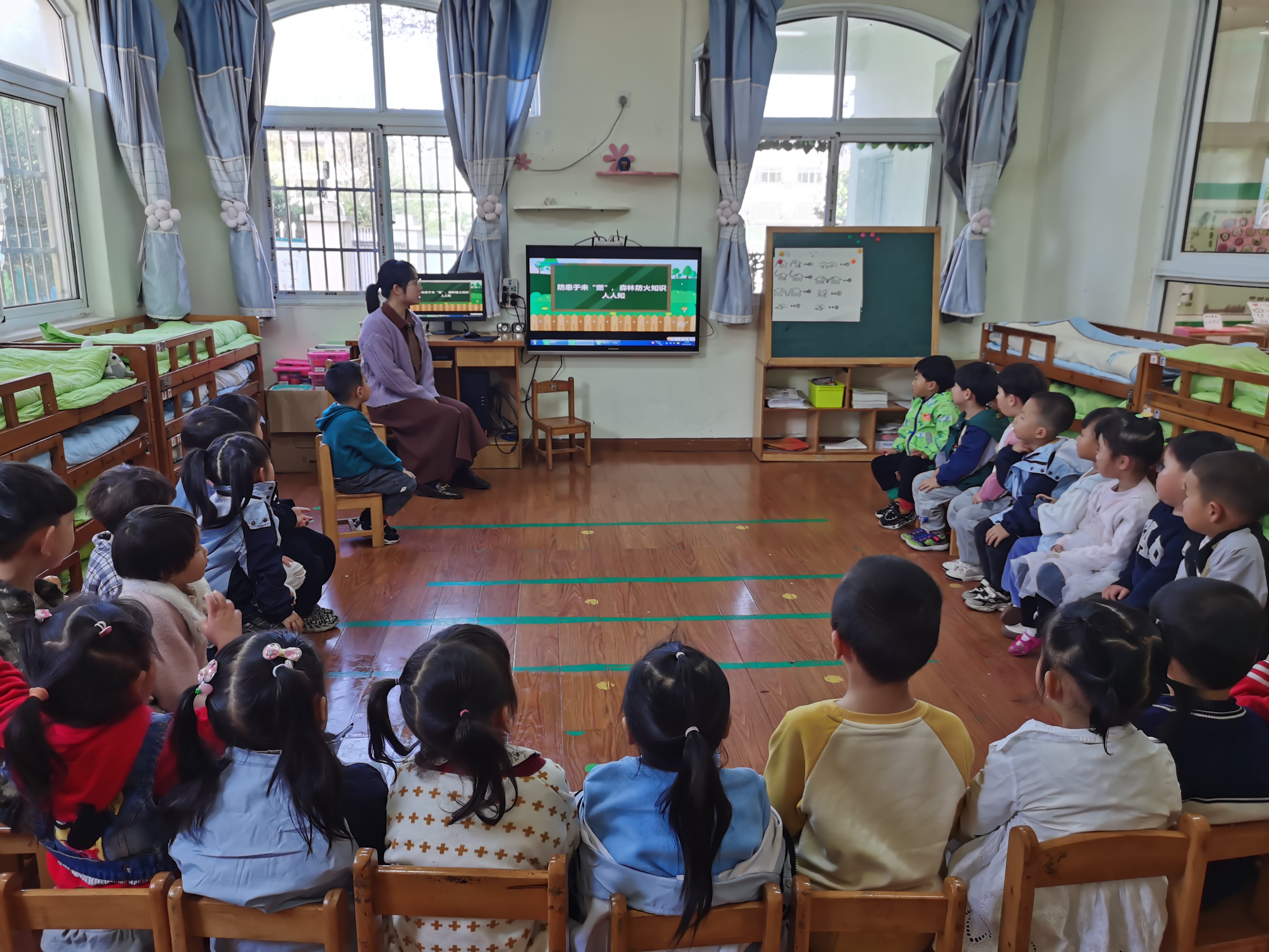 活動中,各班教師通過播放圖片、視頻等方式,形象生動地幫助幼兒了解森林火災(zāi)發(fā)生的原因、如何預(yù)防及應(yīng)對措施,讓孩子們清楚的知道森林防火的重要性,提高了幼兒的護(hù)綠意識和防火意識。同時(shí),老師們將活動延伸到幼兒家庭,通過班級釘釘群、宣傳手冊等方式,向家長宣傳“森林防火”的相關(guān)知識,并組織幼兒與家長進(jìn)行森林防火親子繪畫,進(jìn)一步增強(qiáng)森林防火意識。