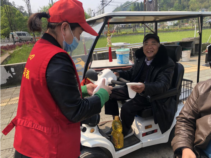 圖為志愿者向殘疾人贈送口罩和食用油。