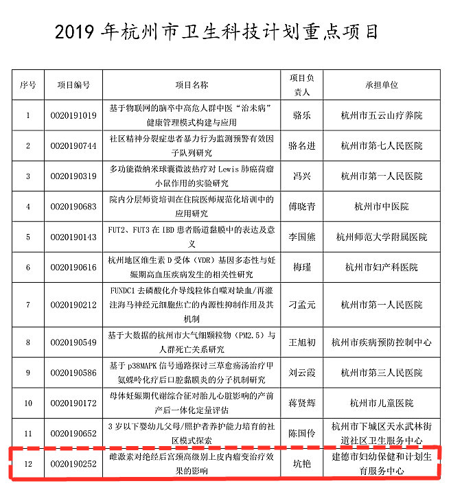 喜報!喜報!近日,2019年度杭州市衛(wèi)生科技計劃項目成績單出爐了!建德市婦幼保健院婦科坑艷博士申報的科研課題成功立項!