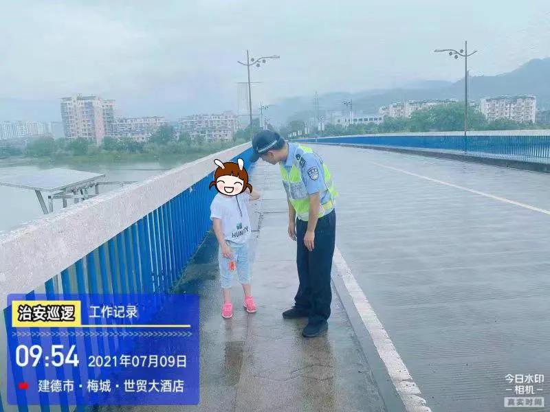 7月9日10時(shí)許,建德交警梅城中隊(duì)民警郭孔懷帶隊(duì)在轄區(qū)巡邏時(shí),發(fā)現(xiàn)一名小女孩獨(dú)自站在嚴(yán)州大橋上。當(dāng)時(shí)天空中下著中雨,小女孩戴著一頂安全頭盔,邊哭邊抹眼淚,郭孔懷見(jiàn)狀立即停車上前詢問(wèn)。
