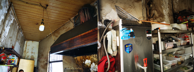 廚房雜亂無章,油漬污垢厚重,垃圾桶未加蓋;場所環(huán)境臟亂差,墻面斑駁脫落;物品隨意擺放,盛放蔬菜的籃子不潔。