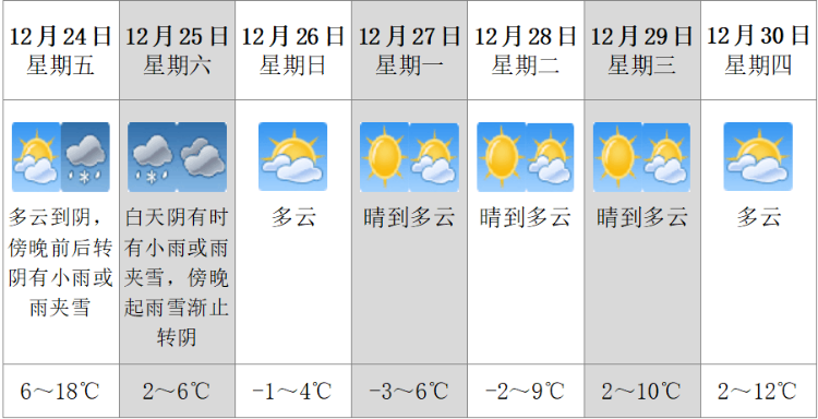 市氣象臺(tái)預(yù)計(jì),24-26日有一次大幅降溫、降水和大風(fēng)天氣過程,日平均氣溫過程降溫幅度可達(dá)8~10℃。其中24日夜里到25日白天有雨或雨夾雪,高山區(qū)有雨夾雪或雪,26-28日早晨最低氣溫大部分地區(qū)-1~-3℃有冰凍,山區(qū)-3~-6℃有嚴(yán)重冰凍。具體來看,今天(24日)多云到陰,傍晚前后起轉(zhuǎn)陰有小雨,夜里陰有雨或雨夾雪,氣溫6~18℃;周六白天陰有時(shí)有雨或雨夾雪,高山區(qū)陰有雨夾雪或雪,傍晚起雨雪漸止轉(zhuǎn)陰到多云,氣溫2~6℃;周日多云到晴,氣溫-1~4℃。