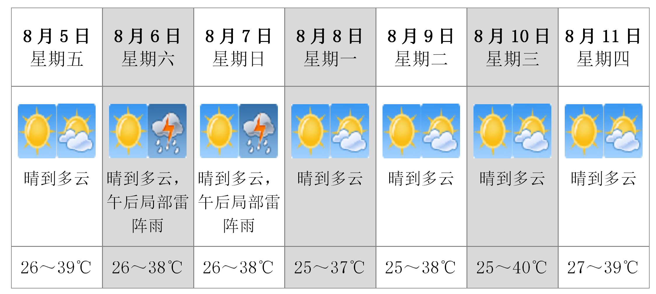 市氣象臺預(yù)計,今天(5日)到周末,最高氣溫38~39℃,距離“4字頭”的極端高溫僅一步之遙,大家務(wù)必減少戶外活動,注意防暑降溫。雖然周末兩天,午后可能會有分散性雷陣雨,但對降溫來說基本無用。