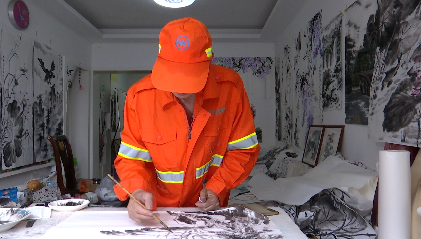 在郎樟華的家中,擺滿了他的畫作,小小的房間里,一張簡陋的長桌就是他的繪畫天地,他總是一站就是兩個小時?;B蟲魚、青山綠水一一在他的筆下呈現(xiàn)。據(jù)了解,郎樟華從小就對繪畫情有獨鐘,從墻畫到現(xiàn)在的山水畫都是通過網(wǎng)上自學(xué)的?,F(xiàn)在從事保潔這份工作也讓他有了更多的時間去追逐自己喜愛的繪畫夢想。