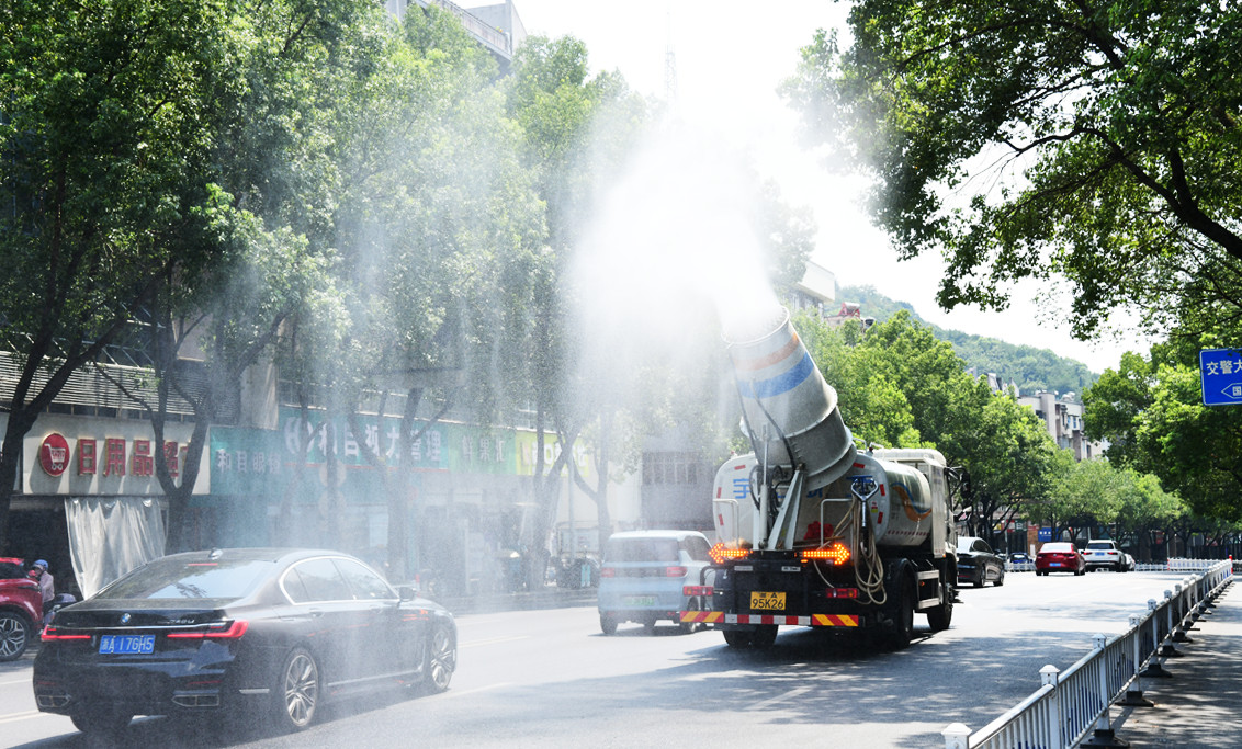 為應(yīng)對(duì)持續(xù)高溫天氣,連日來(lái),我市相關(guān)部門通過(guò)調(diào)配機(jī)械開(kāi)展“濕掃、灑水、沖洗、噴霧”組合作業(yè),濕潤(rùn)干燥路面、降低空氣溫度,為道路上的行人帶去一絲涼意。