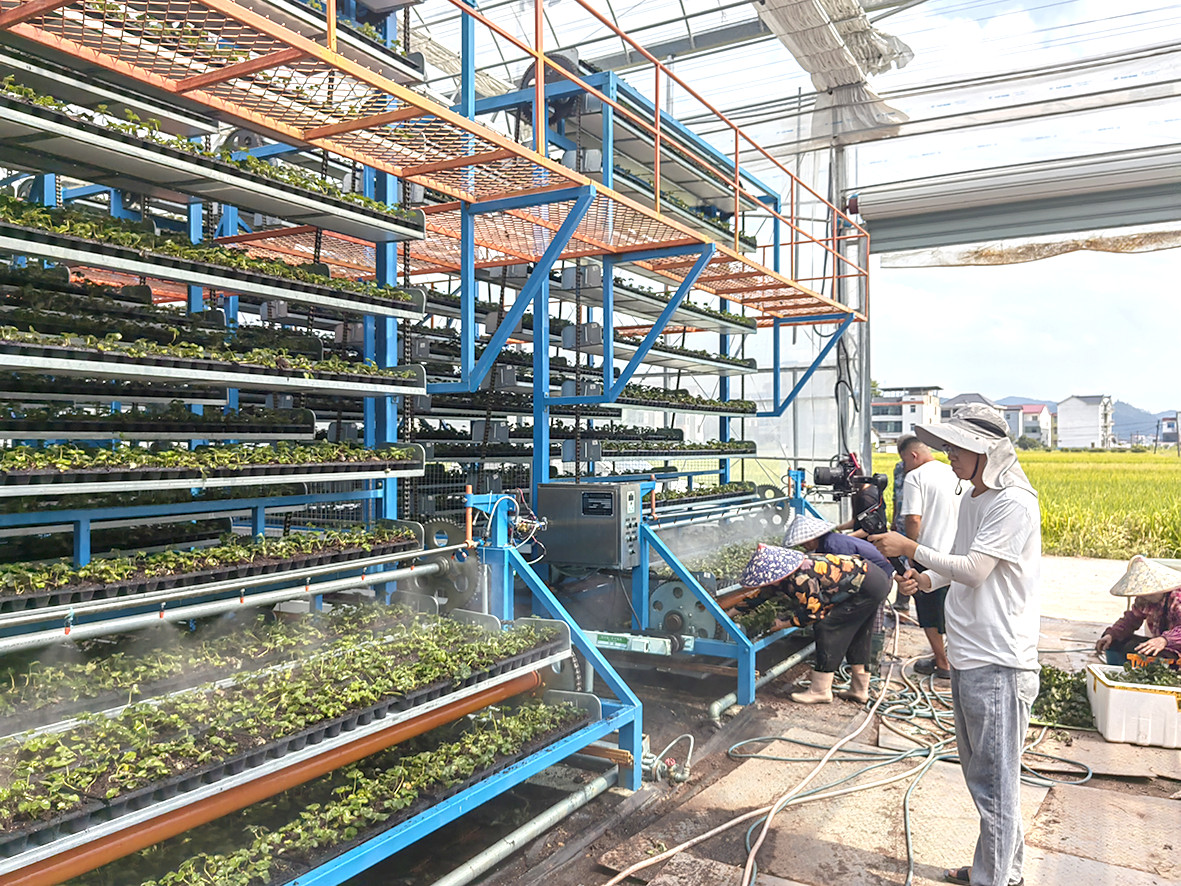據(jù)悉,這套“W鏈?zhǔn)疆€床”設(shè)備安置在大棚溫室內(nèi),外觀類似“立體停車位”,配備自動噴淋系統(tǒng),可通過鏈?zhǔn)睫D(zhuǎn)動讓秧苗均勻接收光照、保持適宜溫濕度。借助該設(shè)備,吳方祥已培育30萬株“建德白鷺”草莓苗,日常管護(hù)僅需1至2人,目前草莓苗長勢良好。
