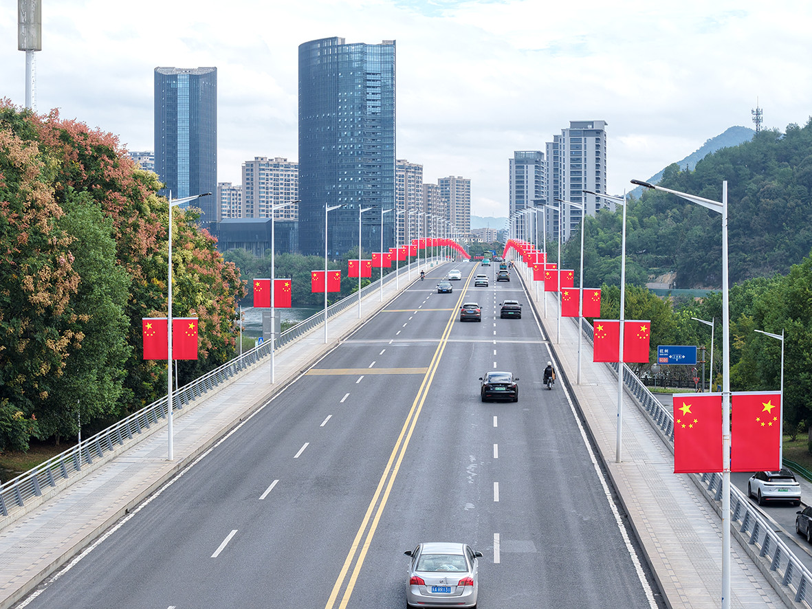 國慶將至,為營造熱烈、喜慶的節(jié)日氛圍,我市在城區(qū)道路、橋梁等處懸掛起鮮艷的五星紅旗,醒目的“中國紅”成為城市中一道亮麗的風景線。