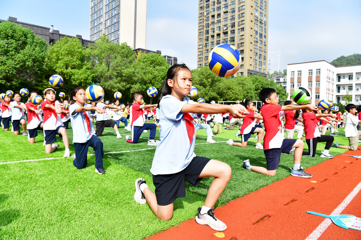 10月15日,在市實驗小學(xué)開展的大課間上,學(xué)生們整齊有序地在操場上跟隨著音樂節(jié)奏練習(xí)排球操。近年來,該校把排球項目作為“一校一品”的特色文體教學(xué)項目,積極鼓勵學(xué)生參加排球運動,發(fā)揚“團結(jié)協(xié)作、頑強拼搏”的精神,讓學(xué)生在體育運動中強健體魄、展示特長。