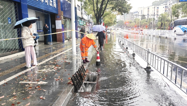 大雨來(lái)襲道路積水 環(huán)衛(wèi)工人全力清理保暢通