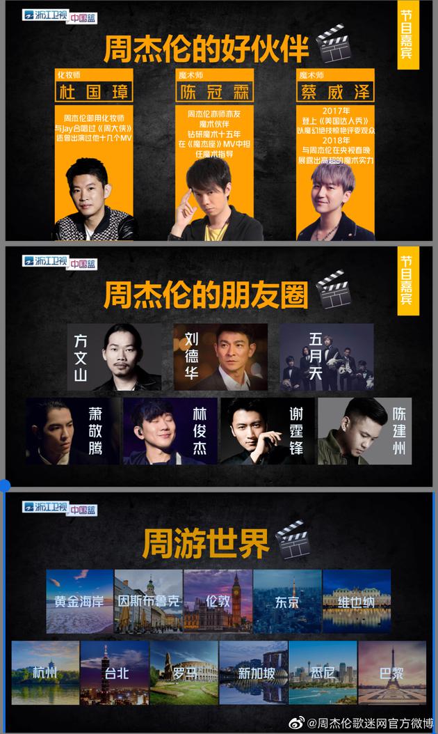 新浪娛樂訊 9月24日,周杰倫[微博]歌迷網(wǎng)官方微博發(fā)文表示,周杰倫將參演新綜藝節(jié)目《周游記》,該節(jié)目定檔浙江衛(wèi)視2020年播出,一季度每周六22點播出,共十二期。方文山[微博]、劉德華、五月天、蕭敬騰[微博]、林俊杰[微博]、謝霆鋒[微博]、陳建州[微博]等將加盟。節(jié)目形式將為每個城市一首周杰倫歌曲,全程無腳本拍攝,周杰倫全程參與。
